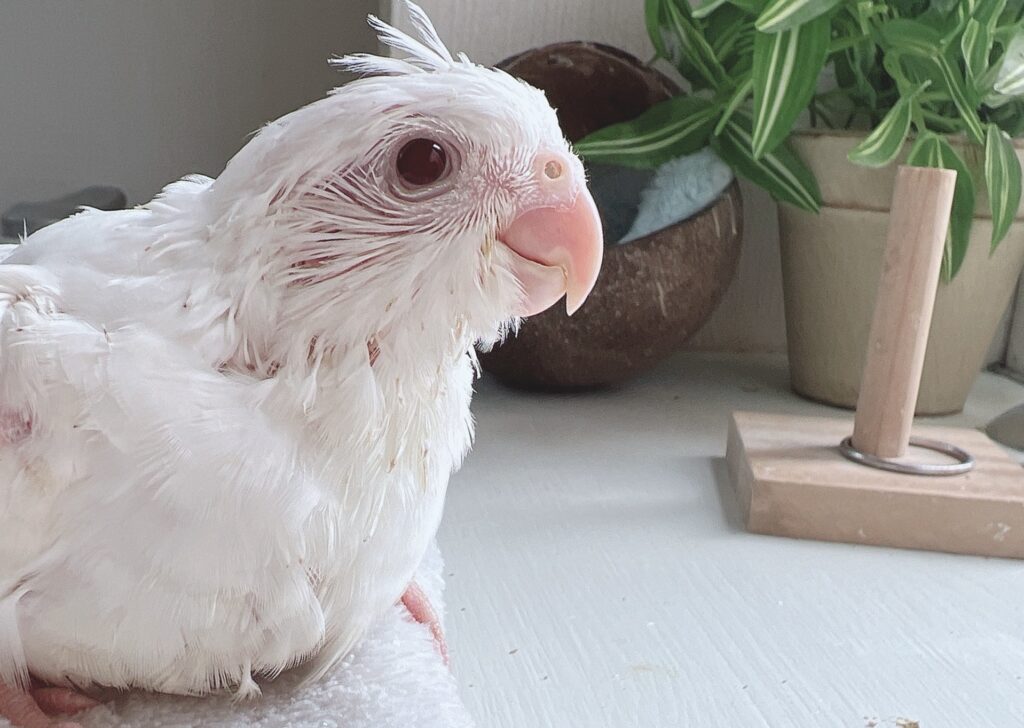 自分たちで羽繕いをしたりで徐々にポロっと取れますのでご安心ください。